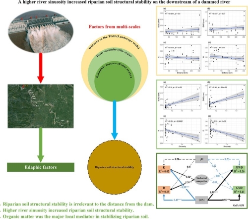 近年來,中科院重慶研究院水庫生態(tài)學(xué)研究中心團(tuán)隊針對上述科學(xué)問題,通過江津-宜昌-城陵磯河庫岸帶長時間序列原位樣品采集、分析與定點監(jiān)測,系統(tǒng)研究了不同水文擾動下河庫岸帶土壤團(tuán)聚體穩(wěn)定特征以及關(guān)鍵膠結(jié)物轉(zhuǎn)化過程,并取得了以下新認(rèn)識:① 河庫岸帶土壤團(tuán)聚體粒徑分布和穩(wěn)定性受到周期性水位波動、土地利用、植物群落等多重因素影響,水文擾動通過改變植物群落屬性、團(tuán)聚體有機(jī)膠結(jié)物質(zhì)進(jìn)而影響團(tuán)聚體粒徑分布與穩(wěn)定性(圖 1、2、3);② 河流形態(tài)對岸帶土壤結(jié)構(gòu)穩(wěn)定性具有重要影響,河流彎曲度較高的河庫岸帶土壤結(jié)構(gòu)穩(wěn)定性也較高,適度增加河流彎曲度有利于提升河庫岸帶土壤結(jié)構(gòu)穩(wěn)定性(圖 4);③ 不同淹水強(qiáng)度下河庫岸帶土壤呼吸與土氣界面碳氮通量差異并不顯著,其主要驅(qū)動因素是微生物群落結(jié)構(gòu)、土壤含水量和溫度,團(tuán)聚體穩(wěn)定性增強(qiáng)對于河庫岸帶土壤碳匯具有重要的促進(jìn)作用(圖 5)。