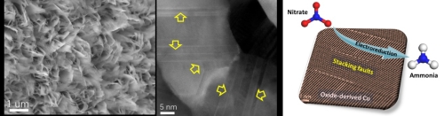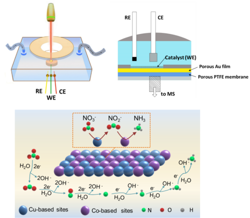 水污染過程與防治研究中心成員針對電化學(xué)還原硝酸鹽反應(yīng)效率低、產(chǎn)物調(diào)控難的問題,解析關(guān)鍵反應(yīng)中間體,研制具有特定幾何形貌和電子結(jié)構(gòu)的電催化劑,助力污水中硝酸鹽的資源化。設(shè)計構(gòu)建三維自支撐氧化銅陣列電極,利用氧化銅在還原電位下原位產(chǎn)生的堆疊缺陷,強化硝酸根吸附并抑制析氫副反應(yīng),提升硝酸鹽的轉(zhuǎn)化效率。進一步構(gòu)建串聯(lián)催化劑,實現(xiàn)了較小能耗下硝酸鹽的還原。該電還原硝酸鹽工藝可與汽提工藝結(jié)合,以生產(chǎn)氯化銨肥料和高純度氨水溶液產(chǎn)品,實現(xiàn)氮素回收和再生水現(xiàn)場回用。