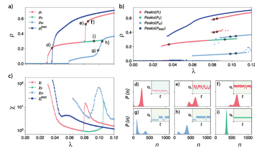 該文闡述了高階網(wǎng)絡(luò)上流行病傳播的最新研究進(jìn)展,并強(qiáng)調(diào)在統(tǒng)計(jì)物理和網(wǎng)絡(luò)科學(xué)領(lǐng)域的貢獻(xiàn)。該文將流行病傳播分為單一傳播和交互傳播兩大類,詳細(xì)介紹相應(yīng)的數(shù)學(xué)模型、理論方法、臨界現(xiàn)象、相變、傳播機(jī)制和影響,并討論了該領(lǐng)域面臨的挑戰(zhàn)和未來(lái)研究的開放問題。文中指出,單一傳播和交互傳播的流行病之間會(huì)呈現(xiàn)不同的傳播現(xiàn)象。單一流行病在簡(jiǎn)單網(wǎng)絡(luò)中傳播時(shí),點(diǎn)對(duì)感染率是決定爆發(fā)閾值和感染范圍的決定性因素,系統(tǒng)呈現(xiàn)出簡(jiǎn)單地相變過(guò)程。在高階網(wǎng)絡(luò)中,高階交互使得系統(tǒng)出現(xiàn)雙穩(wěn)態(tài)、爆炸性轉(zhuǎn)變和遲滯回線(圖4)。對(duì)于交互的流行病,可能呈現(xiàn)出競(jìng)爭(zhēng)、合作以及非對(duì)稱的交互形式。競(jìng)爭(zhēng)作用中的高階交互更容易導(dǎo)致一種流行病的完全滅絕。協(xié)同作用中,高階交互可能進(jìn)一步促進(jìn)流行病的全球爆發(fā)。而非對(duì)稱作用往往被用來(lái)描述防疫信息和流行病傳播的交互。高階交互能有效促進(jìn)信息的傳播同時(shí)抑制疫情的傳播。最后,論文總結(jié)了在高階網(wǎng)絡(luò)上的流行病傳播領(lǐng)域的代表性進(jìn)展,并討論了這一新興領(lǐng)域所面臨的挑戰(zhàn)和有待解決的問題。