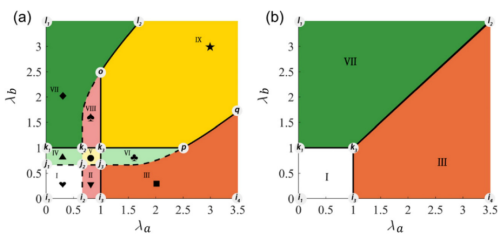 圖3 單純復(fù)形上競(jìng)爭(zhēng)型流行病傳播的相圖