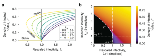 復(fù)雜網(wǎng)絡(luò)(或圖)被應(yīng)用于表示網(wǎng)絡(luò)結(jié)構(gòu),為復(fù)雜場(chǎng)景下兩兩交互的研究提供了強(qiáng)大工具。事實(shí)上,許多實(shí)證系統(tǒng)表現(xiàn)出高階交互,其中主體之間的互動(dòng)不僅發(fā)生在兩兩之間,還涉及到群體層面的集體行為。例如,社會(huì)系統(tǒng)中超級(jí)傳播事件,神經(jīng)科學(xué)涉及多個(gè)神經(jīng)元的觸發(fā)事件,科學(xué)中的共同作者關(guān)系,以及生物學(xué)中的蛋白質(zhì)相互作用。因此,高階網(wǎng)絡(luò),包括超圖和單純復(fù)形,作為更好的工具來(lái)描繪真實(shí)和人工系統(tǒng)中的集體行為,自然地將兩兩交互的范式擴(kuò)展到高階交互(圖1)。致力于研究流行病傳播在高階網(wǎng)絡(luò)上的相互作用機(jī)制,科學(xué)家們發(fā)現(xiàn)高階相互作用的引入從根本上改變了傳播動(dòng)力學(xué),導(dǎo)致了雙穩(wěn)態(tài)、爆炸性轉(zhuǎn)變和遲滯回線等現(xiàn)象(圖2和圖3)。此外,高階交互的存在還深刻地影響著如信息擴(kuò)散、掩護(hù)博弈、滲流和同步等各種動(dòng)力學(xué)過(guò)程。