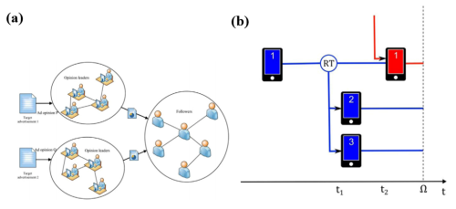 圖 5 高階網(wǎng)絡(luò)上的社會(huì)傳播模型。(a)競(jìng)爭(zhēng)型廣告交互模型。(b)通過(guò)屏幕轉(zhuǎn)發(fā)的行為傳播模型。