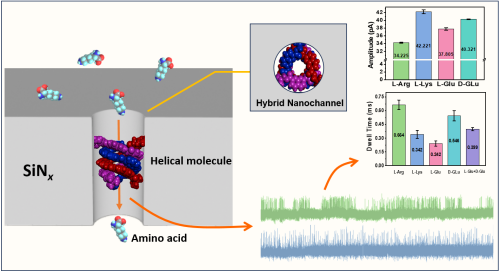 中科院重慶研究院精準(zhǔn)醫(yī)療中心與華中科技大學(xué)合作,構(gòu)建了新型有機(jī)/無機(jī)復(fù)合納米通道并用于單氨基酸及手性的鑒別。本工作設(shè)計(jì)的芳香酰胺手性分子能在溶液相中自發(fā)折疊成螺旋結(jié)構(gòu)通道,類氨基酸螺旋分子作為納米通道具有良好的離子傳輸選擇性和穩(wěn)定性,可媲美天然蛋白通道的性能。我們聯(lián)合無機(jī)氮化硅材料的物化穩(wěn)定性及有機(jī)螺旋手性分子的可設(shè)計(jì)及內(nèi)腔可調(diào)等性質(zhì),構(gòu)筑新型無脂質(zhì)支撐的小尺寸類蛋白復(fù)合手性納米通道,形成外表堅(jiān)固,內(nèi)表尺寸和表面性質(zhì)高度可重現(xiàn)的穩(wěn)定分析平臺(tái)。本文構(gòu)建的復(fù)合通道在不同離子溶液中表現(xiàn)出良好的離子傳輸性能,并實(shí)現(xiàn)了不同單氨基酸及氨基酸手性對(duì)映體的鑒別,呈現(xiàn)了具有亞納米級(jí)有機(jī)/無機(jī)雜化離子通道在單氨基酸水平上對(duì)肽和蛋白質(zhì)傳感的潛能,為復(fù)合固態(tài)納米通道測(cè)序應(yīng)用鋪平了道路。
