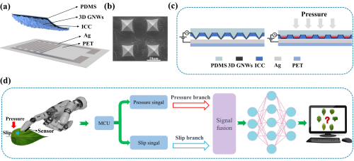 近日,中國科學(xué)院重慶綠色智能技術(shù)研究院機器人技術(shù)與系統(tǒng)中心報道了一種通過壓覺和滑覺的共同感知來識別相似物體的方法。在本工作中,研究團隊制備了一種具有三維共形石墨烯納米墻和梯度共形離子涂層的高性能柔性壓力傳感器,傳感器表現(xiàn)出卓越的靈敏度(92.96 kPa-1)、高信噪比(48 dB)、低檢測限(< 1 Pa)以及超過15000個壓縮-釋放循環(huán)的出色穩(wěn)定性。鑒于其卓越的性能,傳感器能夠區(qū)分不同葉片之間的細微硬度差異,并能準(zhǔn)確地還原其表面紋理。數(shù)據(jù)采集過程中通過壓覺/滑覺的共同作用來獲取葉片的硬度和紋理信息,提出了一種雙分支特征融合卷積神經(jīng)網(wǎng)絡(luò),對六種葉片的識別率(97.16%)顯著優(yōu)于單一感知方式(壓覺91.83%,滑覺94.83%)。并成功地將傳感器集成到機器人靈巧手指尖,進行了在線葉片識別實驗,其識別率明顯超越了人手。這種高性能柔性觸覺傳感系統(tǒng)有助于增強機器人的觸覺感知能力,同時為相似物體識別提供了新的思路,促進了下一代機器人智能化發(fā)展。