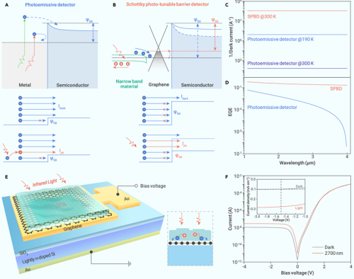 內(nèi)光發(fā)射效應(yīng)(Internal Photoemission Effect)作為光電效應(yīng)的重要分支,闡明了光照射至金屬-半導(dǎo)體界面時,熱載流子如何被激發(fā)并跨越肖特基勢壘,最終進入半導(dǎo)體以完成光電轉(zhuǎn)換的物理過程。自1967年以來,研究者一直致力于基于內(nèi)光發(fā)射效應(yīng)的肖特基光電探測器研究,并在拓展響應(yīng)光譜范圍和開發(fā)與硅工藝兼容的紅外探測器方面取得了突破。然而,相關(guān)探測器的性能一直受制于截止波長與暗電流之間的矛盾,且通常需要在低溫條件下運行。